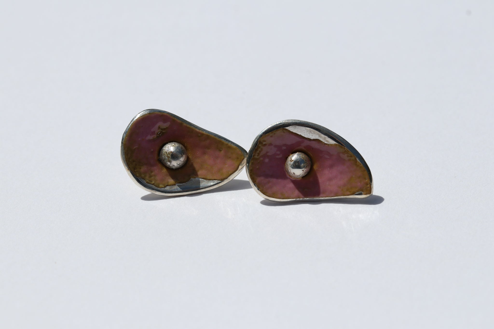 Each piece is handcrafted in sterling silver and finished with a layer of vibrant pink enamel, creating a leaf-inspired form that glows softly in the light. The organic shape and delicate colour make them perfect for both everyday wear and special occasions.